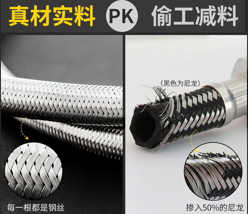 實驗證明:金屬軟管采用201不銹鋼,具有不走絲,燒不著等優(yōu)點,將不銹鋼和尼龍混在一起,品質(zhì)經(jīng)不起火煉。 |