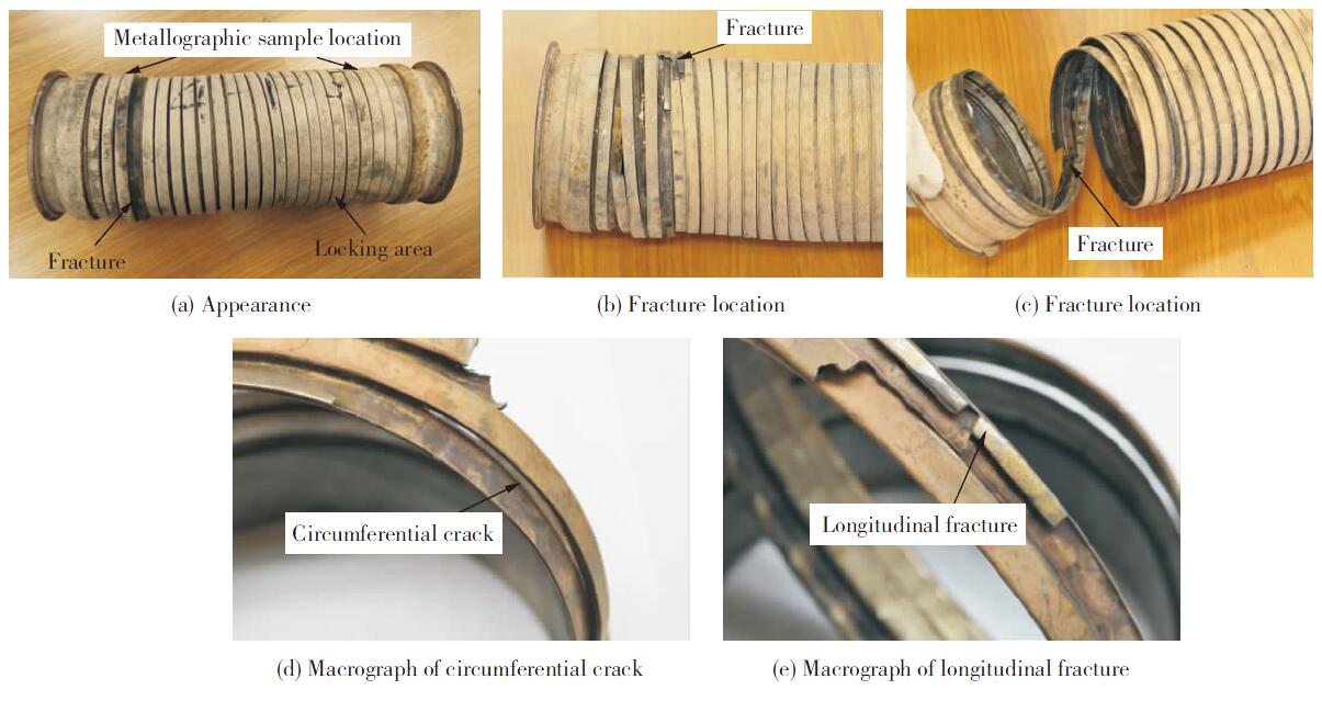 本研究所分析的金屬軟管為ASS 型結(jié)構(gòu),如圖1所示。在使用過(guò)程中發(fā)生了斷裂,其余部分位置則卡死不能伸縮。故障時(shí)行駛里程為3萬(wàn)多km(標(biāo)準(zhǔn)要求是保證10萬(wàn)km內(nèi)不失效) ,其使用壽命遠(yuǎn)遠(yuǎn)低于預(yù)期。經(jīng)市場(chǎng)返回的統(tǒng)計(jì)數(shù)據(jù),同類型的金屬軟管發(fā)生較大比例斷裂,其斷裂的里程基本都集中在4萬(wàn)km 以下。本研究對(duì)失效的金屬軟管進(jìn)行宏觀分析、斷口分析、金相分析、能譜分析等,找到金屬軟管發(fā)生斷裂和卡死失效的原因,并提出改進(jìn)建議。